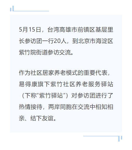 【北京】臺(tái)灣高雄市前鎮(zhèn)區(qū)基層里長參訪團(tuán)到紫竹社區(qū)養(yǎng)老服務(wù)驛站參訪交流